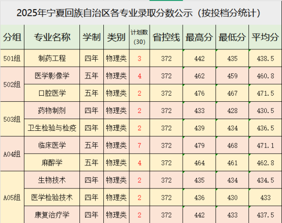 牡丹江医科大学2025年宁夏回族自治区各专业录取分数公示(按投档分统计)
