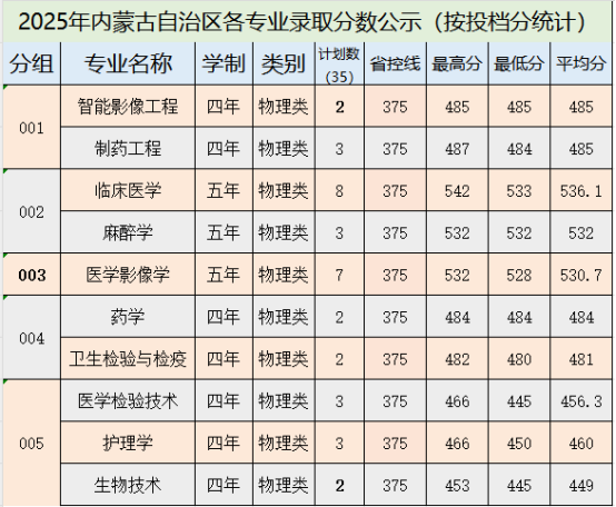 牡丹江医科大学2025年内蒙古自治区各专业录取分数公示(按投档分统计)