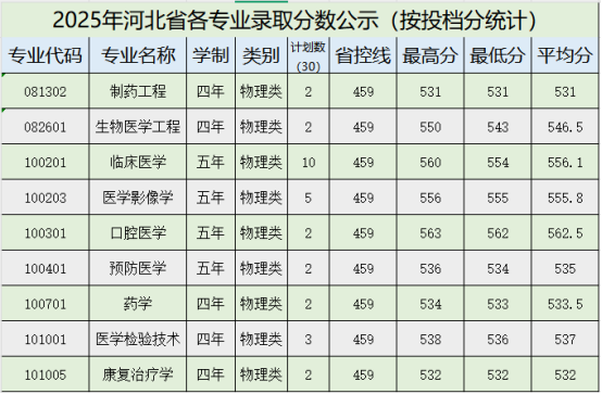 牡丹江医科大学2025年河北省各专业录取分数公示(按投档分统计)