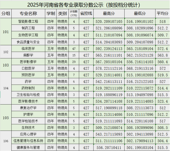 牡丹江医科大学2025年河南省各专业录取分数公示(按投档分统计)