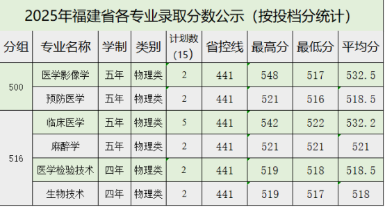 牡丹江医科大学2025年福建省各专业录取分数公示(按投档分统计)