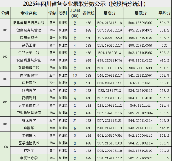 牡丹江医科大学2025年四川省各专业录取分数公示(按投档分统计)