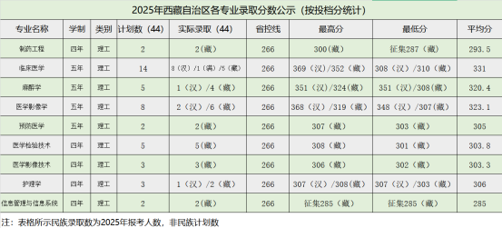 牡丹江医科大学2025年西藏自治区各专业录取分数公示(按投档分统计)