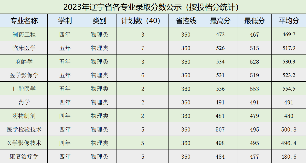 牡丹江医学院2023年辽宁省各专业录取分数公示(按投档成绩)