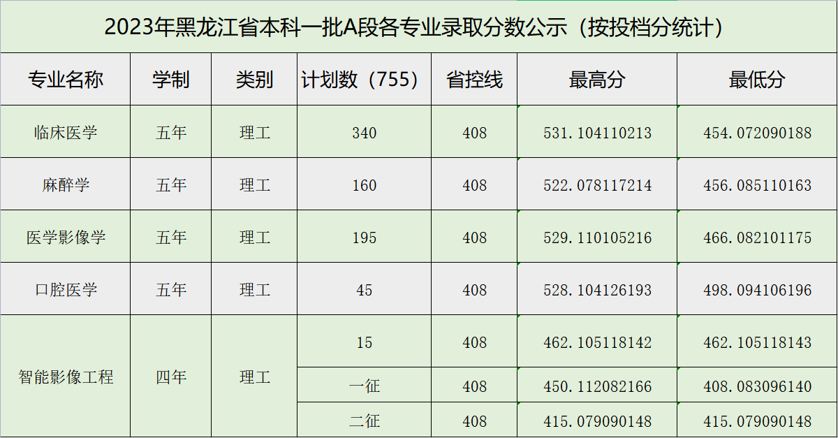 牡丹江医学院2023年黑龙江省本科一批A段各专业录取分数公示(按投档成绩)