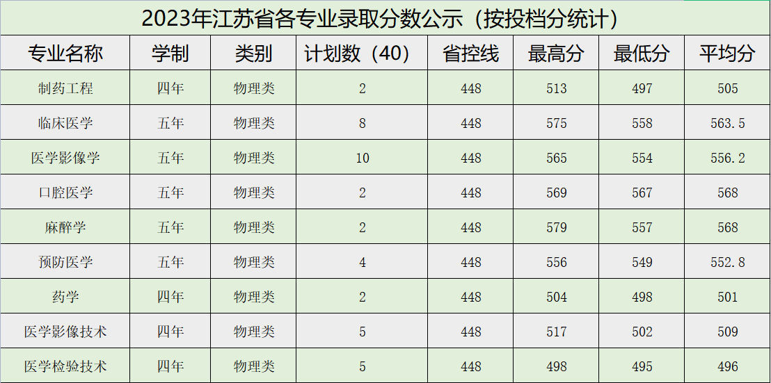 牡丹江医学院2023年江苏省各专业录取分数公示(按投档成绩)