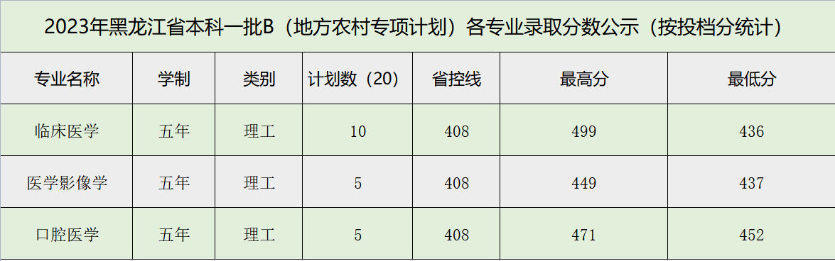 牡丹江医学院2023年黑龙江省本科一批B段(地方农村专项计划)各专业录取分数公示(按投档成绩)