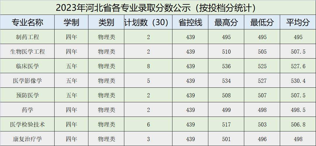 牡丹江医学院2023年河北省各专业录取分数公示(按投档成绩)