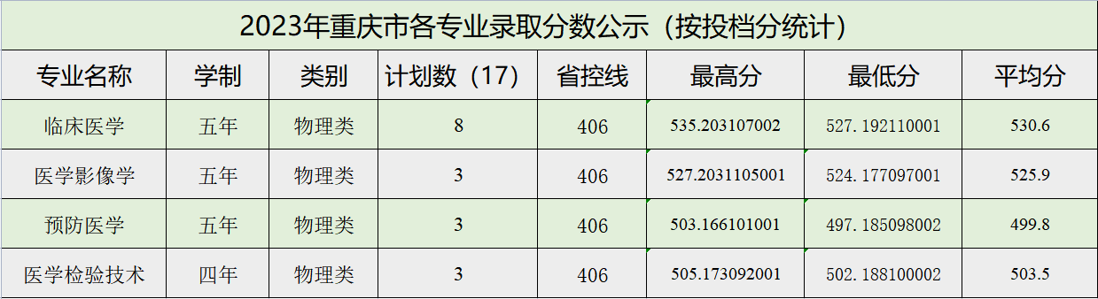 牡丹江医学院2023年重庆市各专业录取分数公示(按投档成绩)