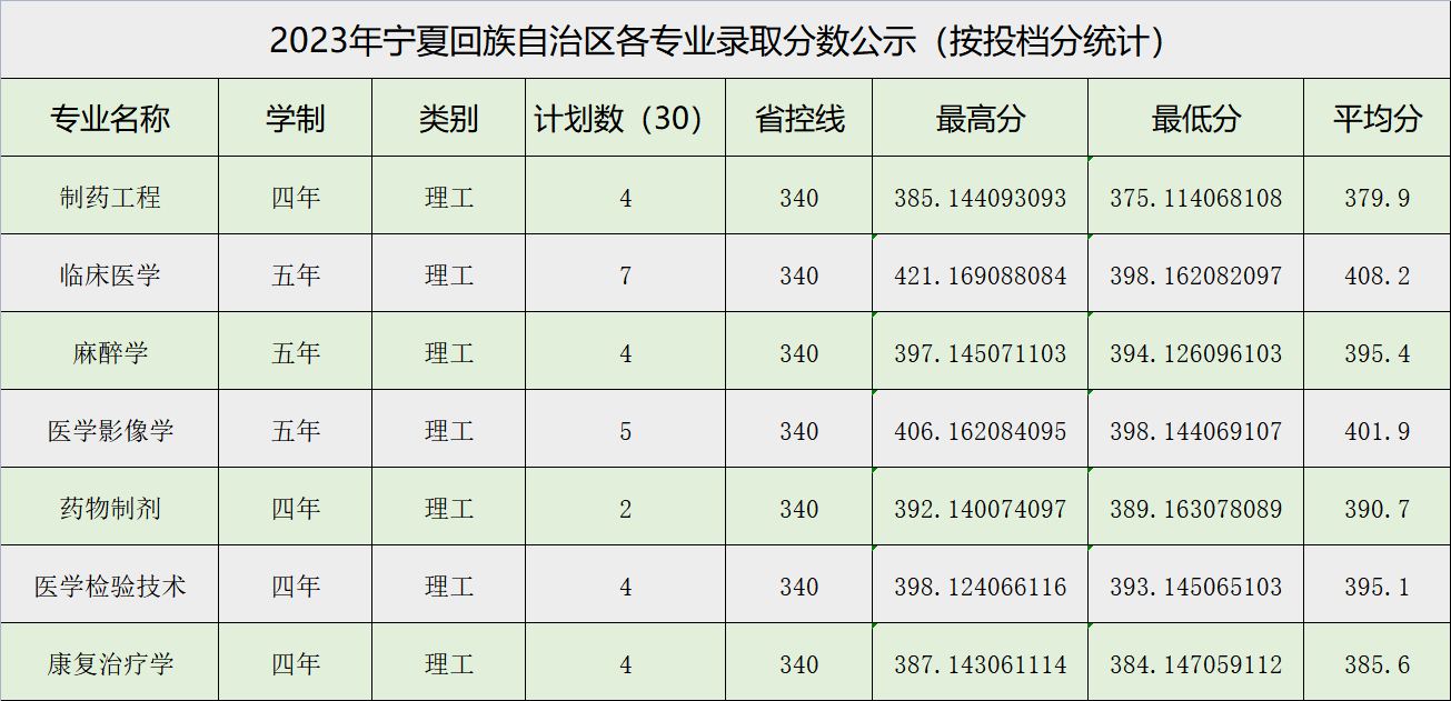 牡丹江医学院2023年宁夏回族自治区各专业录取分数公示(按投档成绩)