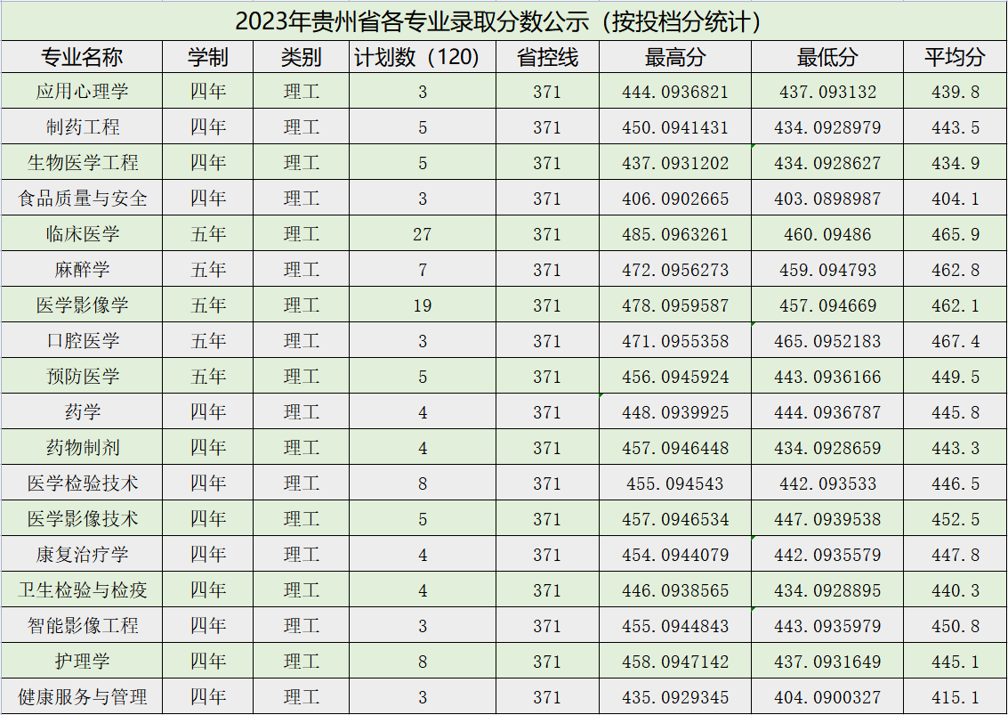 牡丹江医学院2023年贵州省各专业录取分数公示(按投档成绩)