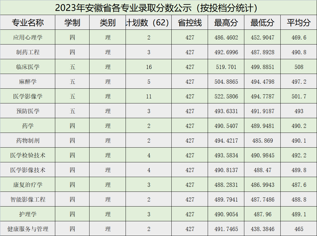 牡丹江医学院2023年安徽省各专业录取分数公示(按投档成绩)