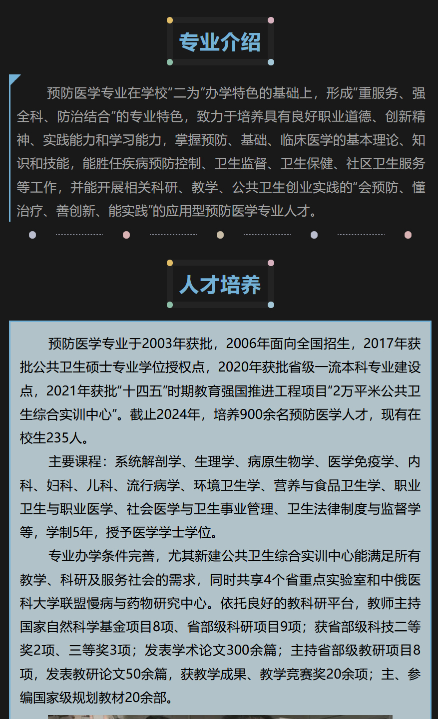 1.培养目标:具备预防医学、基础医学和临床医学的基本理论、基本知识和基本技能,能够胜任疾病预防控制、卫生监督、卫生检疫、卫生保健、健康促进、社区卫生服务等工作,并能开展相关科研、教学、公共卫生创业实践的应用型专业人才。