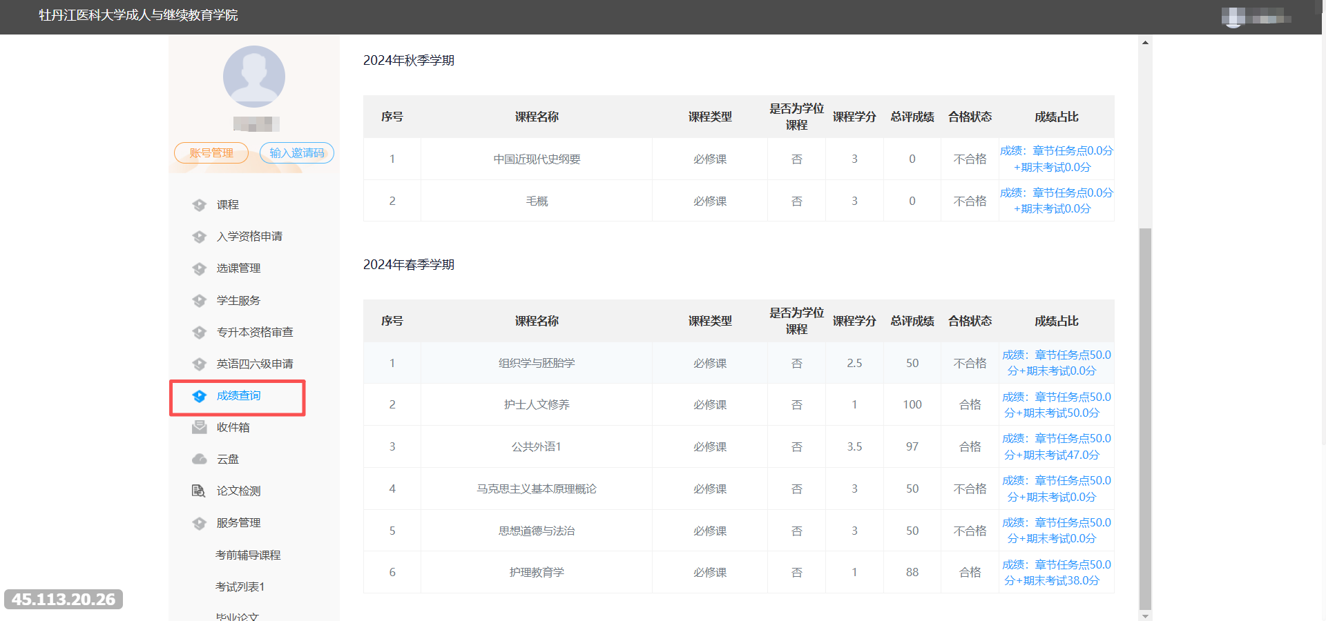进入左侧成绩查询模块进入查看成绩。
