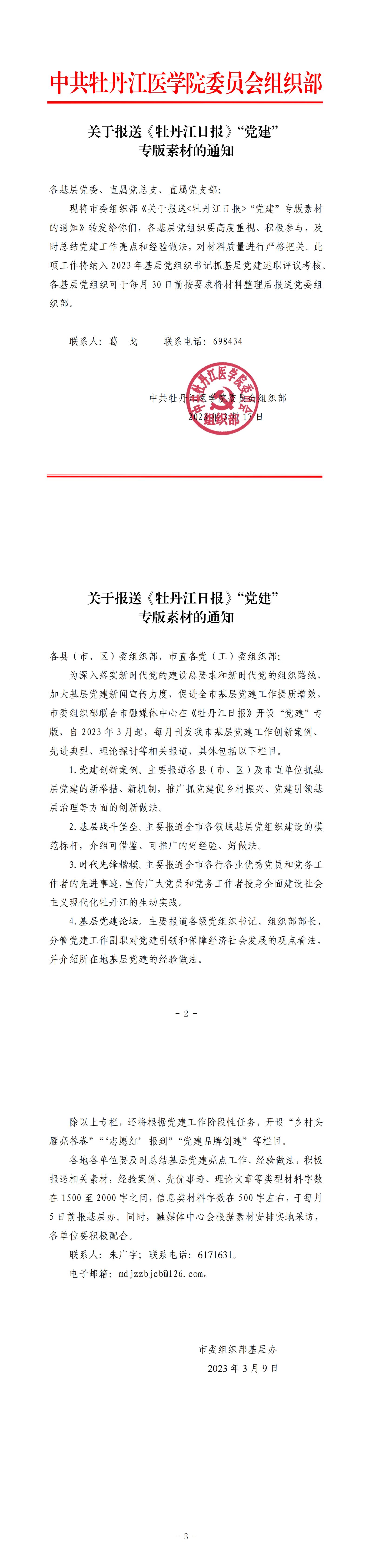关于报送《牡丹江日报》“党建”专版素材的通知