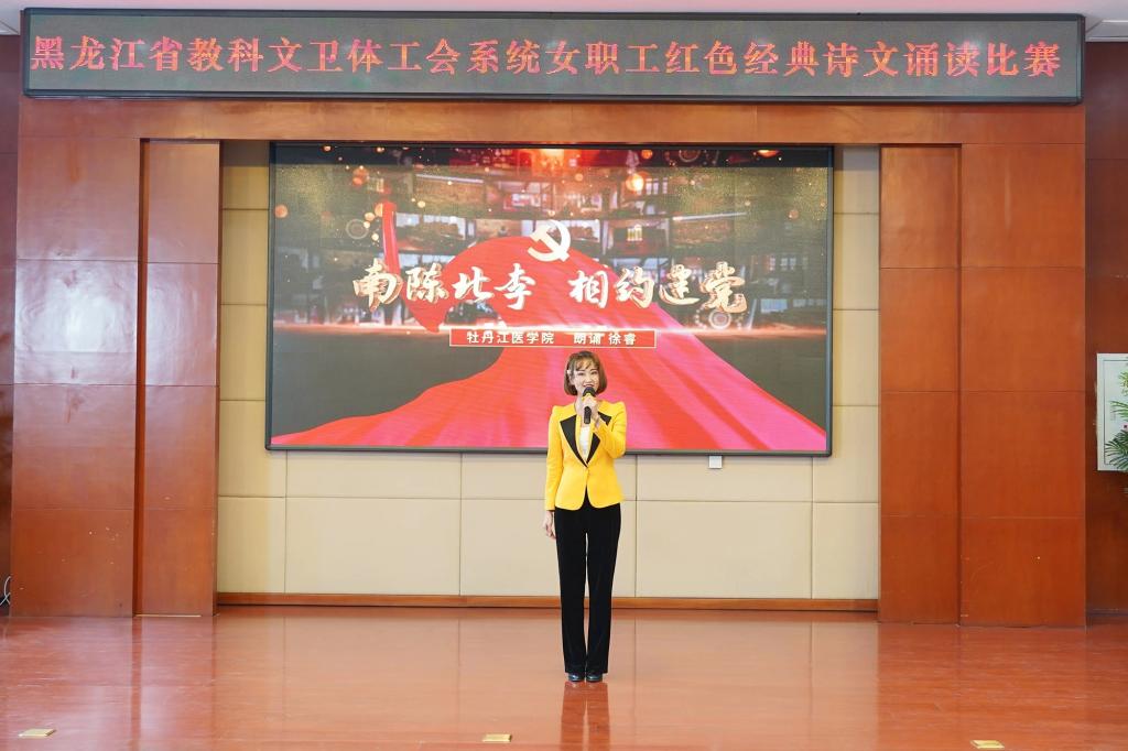 在黑龙江省工会干部管理学院决赛现场,来自全省教育、科技、文化和旅游、卫生健康、体育系统的优秀选手同台角逐,我校徐睿老师对作品《南陈北李 相约建党》饱含深情、铿锵有力的倾情演绎,惊艳了全场,得到了专家评委的高度评价,最终以全场第二高分斩获一等奖
