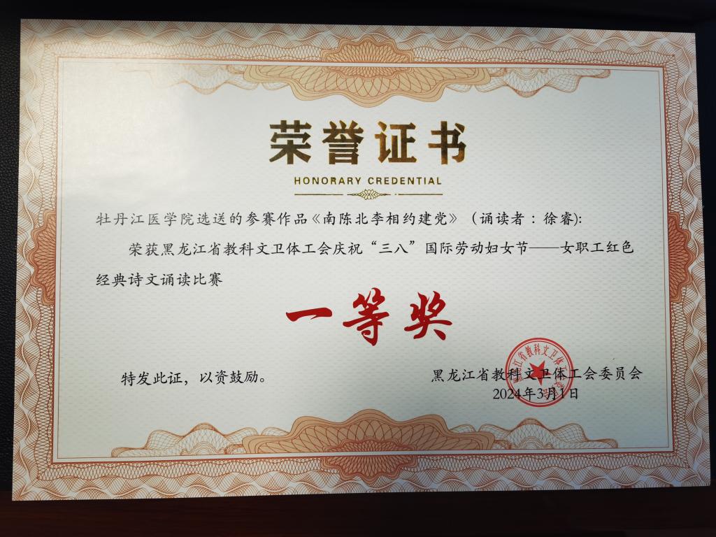 31日,黑龙江省教科文卫体工会庆祝三八国际劳动妇女节——女职工红色经典诗文诵读比赛在哈尔滨圆满落幕。本次比赛分为预赛和决赛两个阶段,历时两个多月,共有136件参赛作品,数百名选手参加比赛。经过赛前准备、视频初赛,最终51件作品进入现场决赛。我校马克思主义学院教师徐睿经过激烈角逐,在众多参赛选手中脱颖而出,荣获一等奖。学校工会获优秀组织奖。
