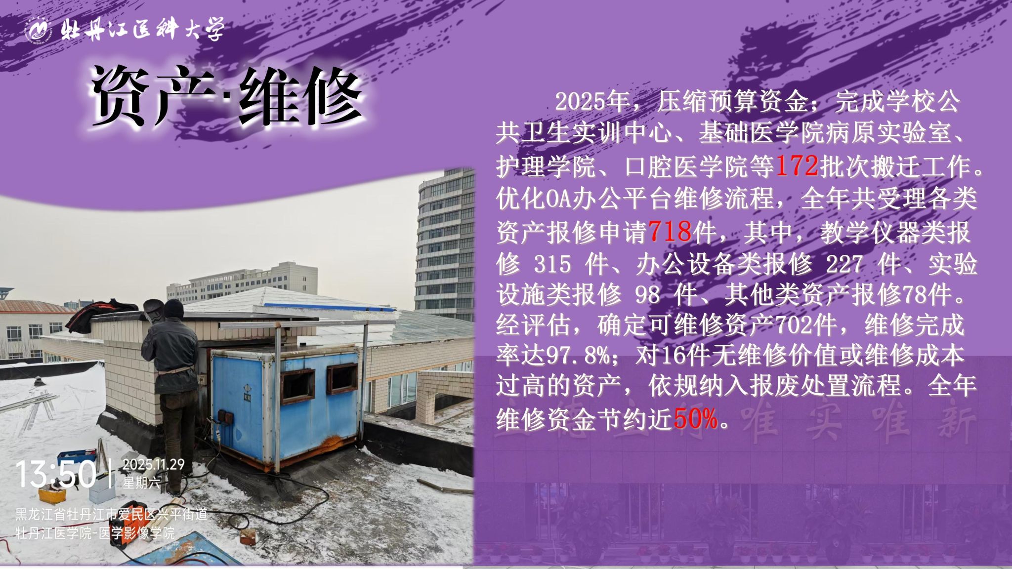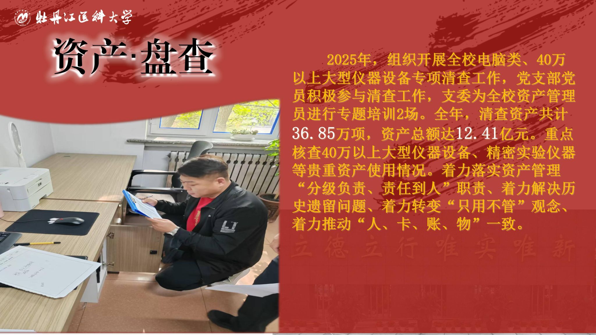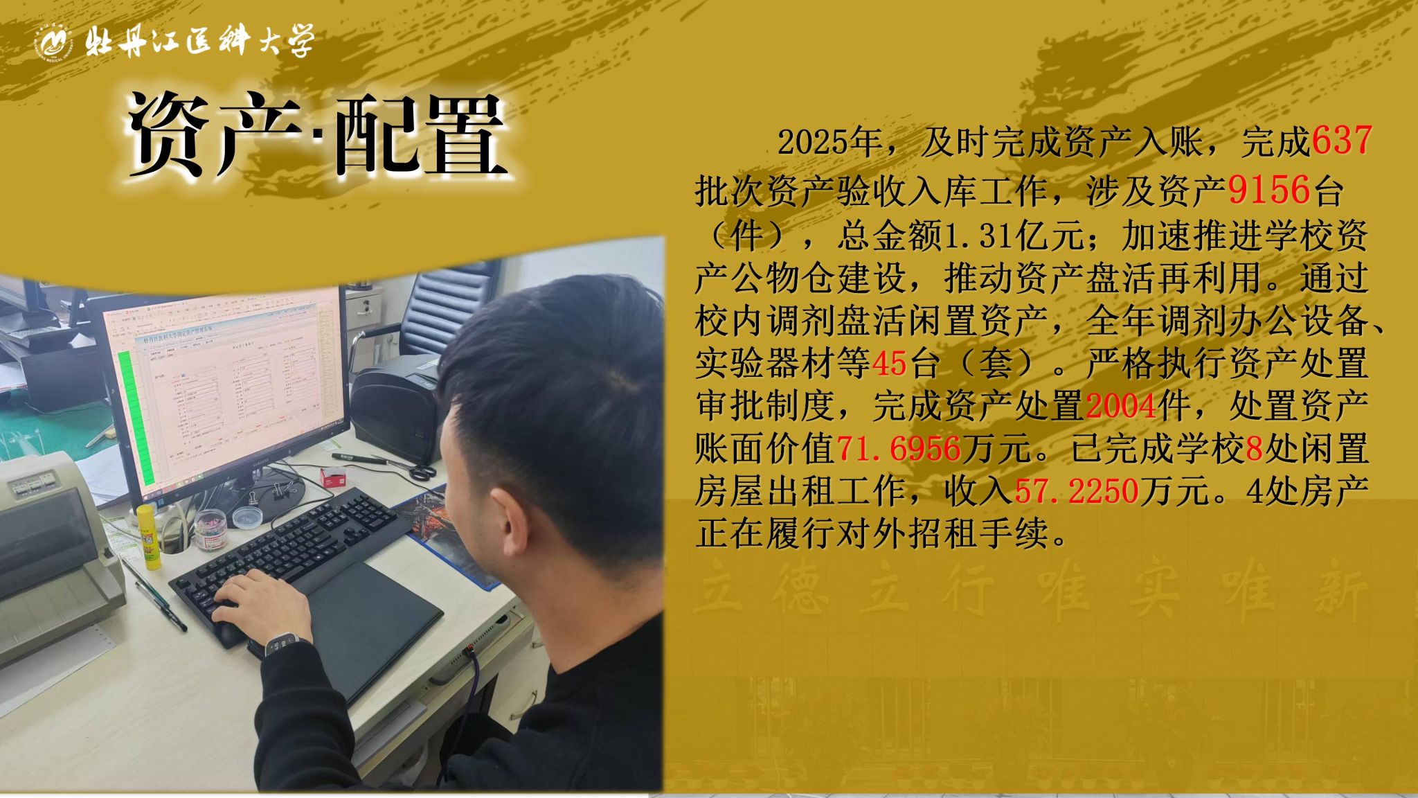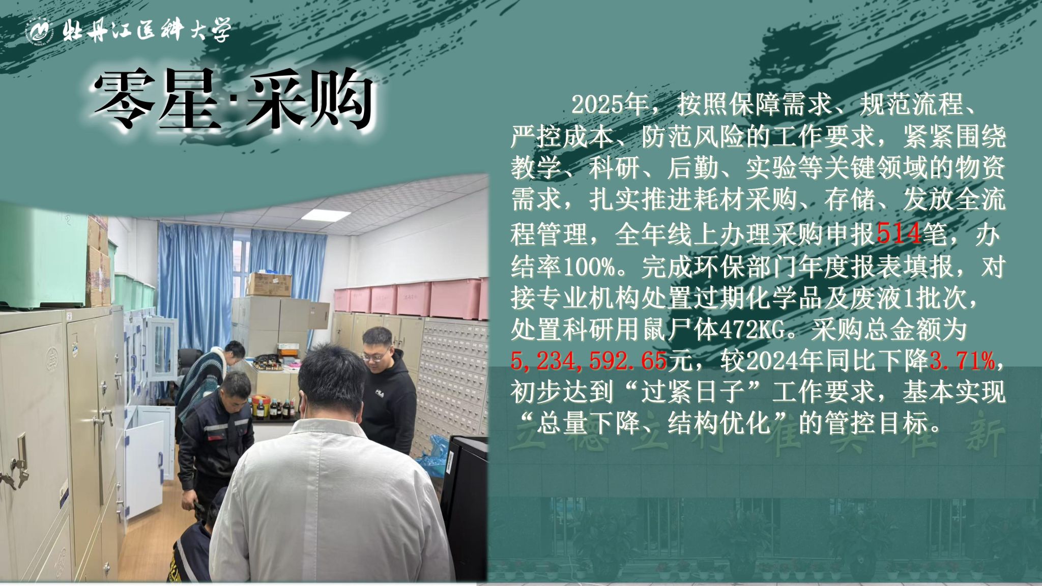 时光荏苒,岁末回眸,2025年,国有资产管理处在学校党委的正确领导下,全面贯彻落实牡丹江医科大学第一次党代表及七届五次教代会精神,紧紧围绕服务教学、科研、管理中心任务,以“制度化建设、精细化管理、高效化服务”为抓手,开源节流、增收节支,扎实推进招标采购、资产管理和零星采购工作,为高质量完成学校“十四五”规划提供坚实的保障。