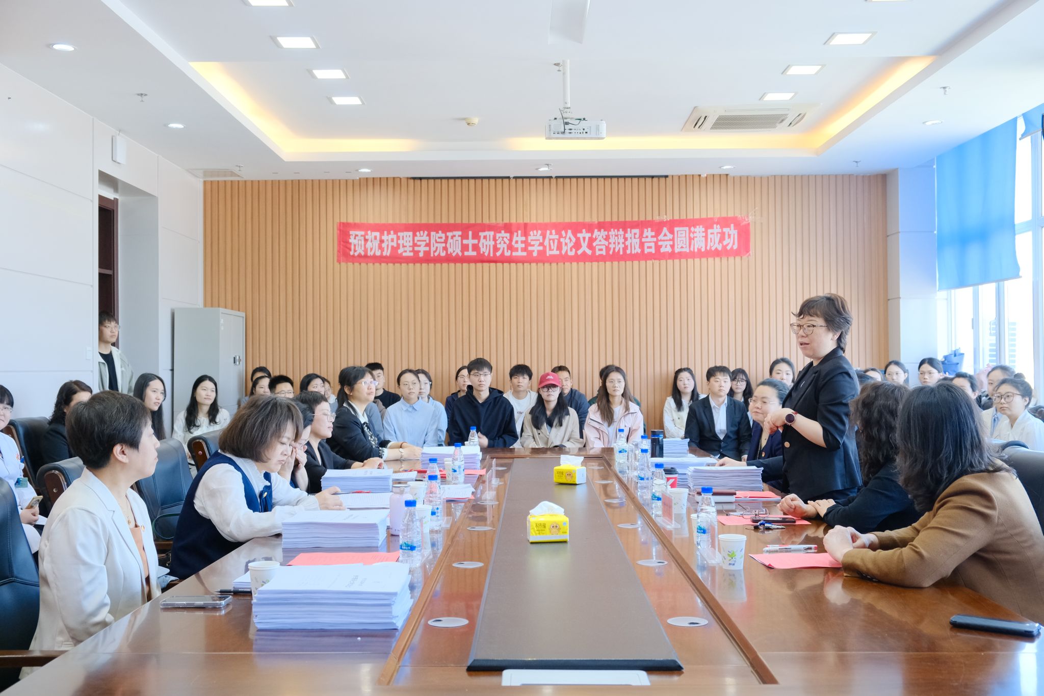 护理学院于2025年5月23日上午8:30-17:30如期举行了2025届毕业硕士研究生学位论文答辩报告会。本次答辩会特邀哈尔滨医科大学护理学院院长范宇莹教授担任答辩委员会主席,院外专家关红军博士、马春丽博士及学科校外导师杨丽妲研究员、冷菲菲主任护师、校内导师林英教授、薛平教授担任答辩委员会成员,护理学院张未来党总支书记、牟景敏院长全程参加了此次答辩报告会。本次答辩会也同步采用钉钉线上直播的方式进行,来自院内、院外的护理同仁、研究生及导师共计80余人参加了答辩会。
