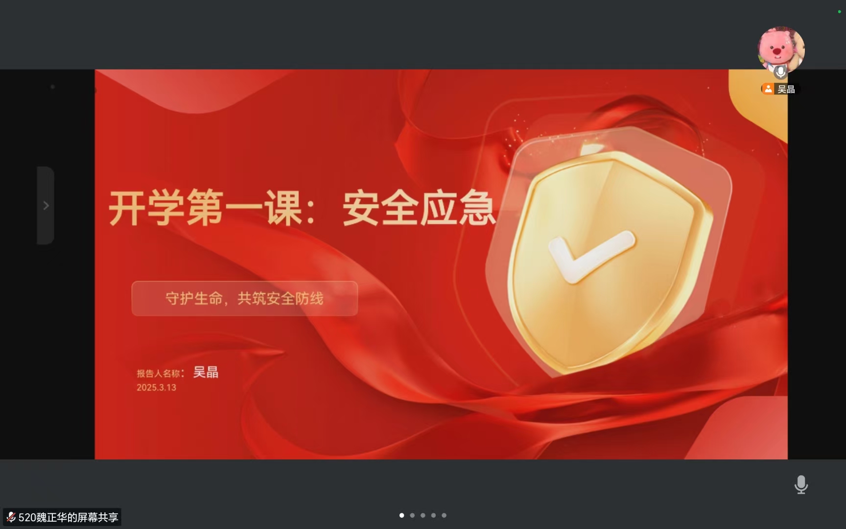 为切实提升学生的安全意识,增强应对突发事件的能力,2025年3月13日,22级护理第二团总支在线上开展了开学第一课“安全应急——守护生命,共筑安全防线”主题班会。此次班会由22级8班班长吴晶主持,辅导员赵健博老师、2022级4-8班全体学生参加,共同开启新学期安全学习之旅。