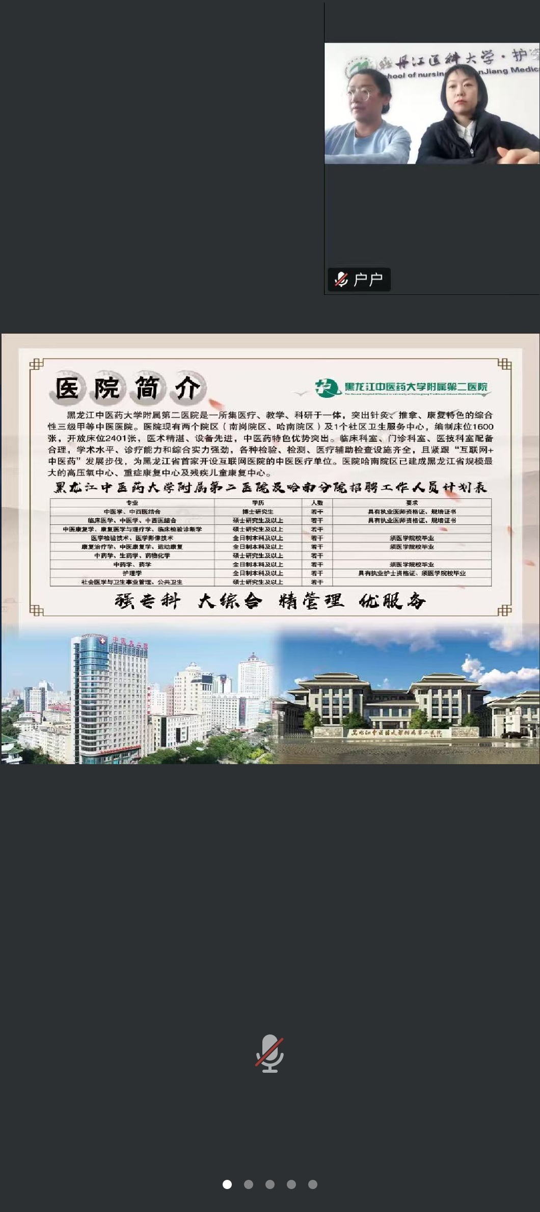 招聘会伊始,护理学院院长牟景敏向用人单位介绍学院的概况,并向会单位表示诚挚感谢与热烈欢迎。随后,泰康之家康复医院人力资源部于婷、黑龙江中医药大学附属第二医院人力资源部王琳晶、镜泊湖疗养院院长王天义等招聘负责人依次展开宣讲。他们围绕企业概况、文化内涵、人才需求、薪资福利等核心内容,进行了全面且细致的介绍,让毕业生对各单位有了深入了解。宣讲结束后,用人单位与毕业生通过线上平台展开热烈互动,答疑解惑,充分交流求职意向与岗位需求。