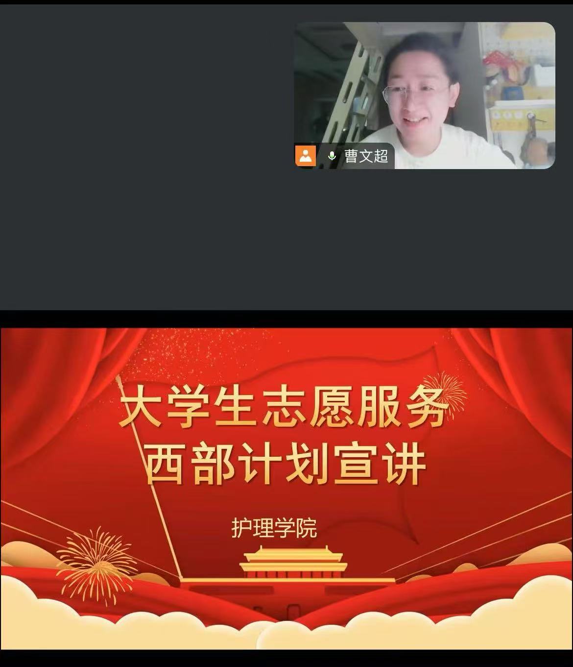 “到西部去,到基层去,到祖国和人民最需要的地方去。”3月3日,护理学院通过腾讯会议平台开展以“青春筑梦西部,志愿点亮未来”的大学生志愿服务西部计划专场宣讲会,进一步引导高校毕业生到基层工作、到乡村工作。宣讲会邀请了护理学院2024年西部计划志愿者赵鹏飞为宣讲嘉宾,本次宣讲会由护理学院实习就业科曹文超主持,护理学院70余名同学参加了本次宣讲会。