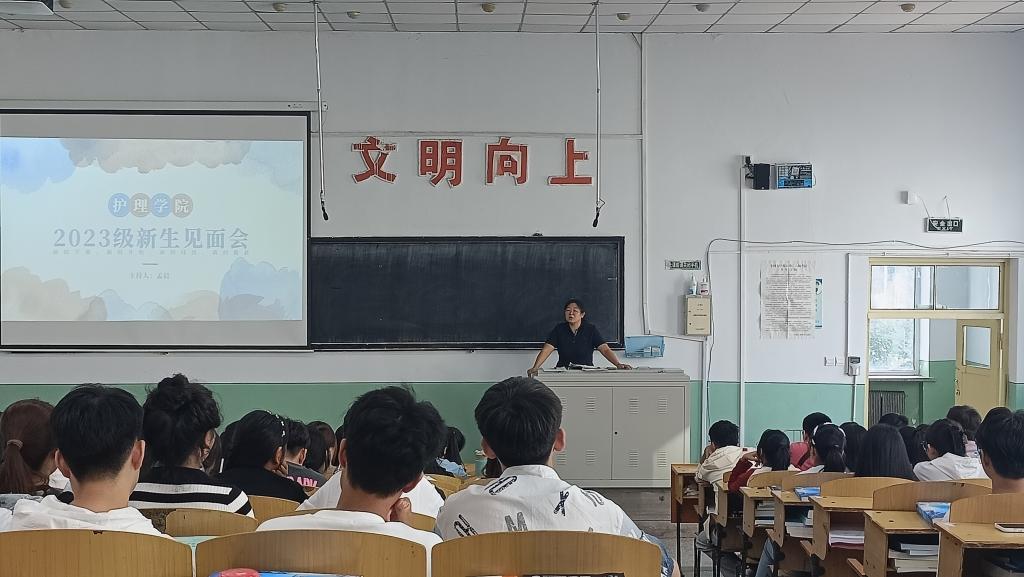 新的起点、新的校园、新的生活。为更好地为新生答疑解惑,了解大学生活环境,融入大学校园,营造积极向上的校园文化氛围,让同学们尽快以全新的面貌投入新的学习征程。护理学院于2023年8月26日在计算机阶梯二教室召开2023级新生见面会,新生辅导员孟晨老师主持会议。