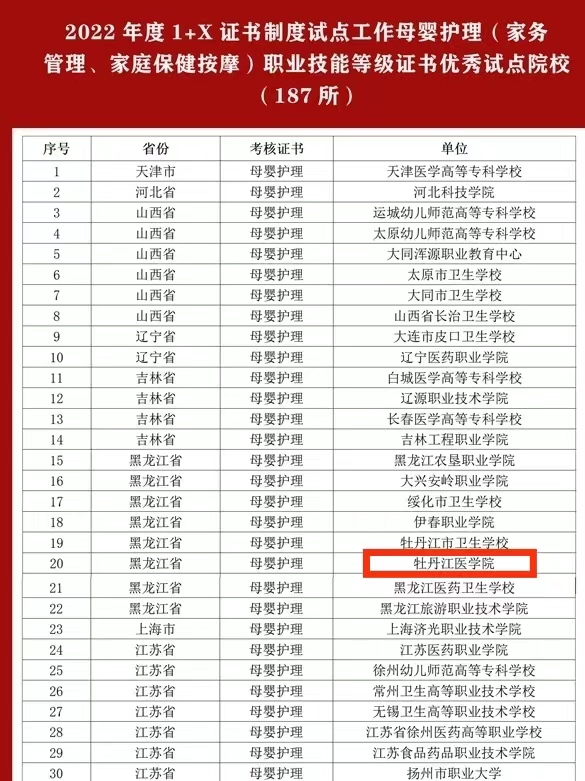 为更好地贯彻落实《国家职业教育改革实施方案的通知》《教育部等四部门印发关于在院校实施“学历证书+若干职业技能等级证书”制度试点方案的通知》文件精神。教育部指定的职业技能等级第三方培训评价机构,山东济南阳光大姐服务有限公司全面推进母婴护理“1+X”证书制度试点工作。为表彰先进、树立典型,激励全国各所试点院校共同做好“1+X”证书制度试点工作,对出色完成1+X母婴护理职业技能等级证书试点工作的院校进行表彰。