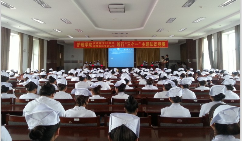 2014年6月26日下午,护理学院在主楼多功能厅举办“庆祝建党93周年、迎接本科专业认证,践行“三个一”主题知识竞赛活动”。党总支书记、副院长钱锐,院长、党总支副书记郎玉玲及全体教师和学生参加本次活动。