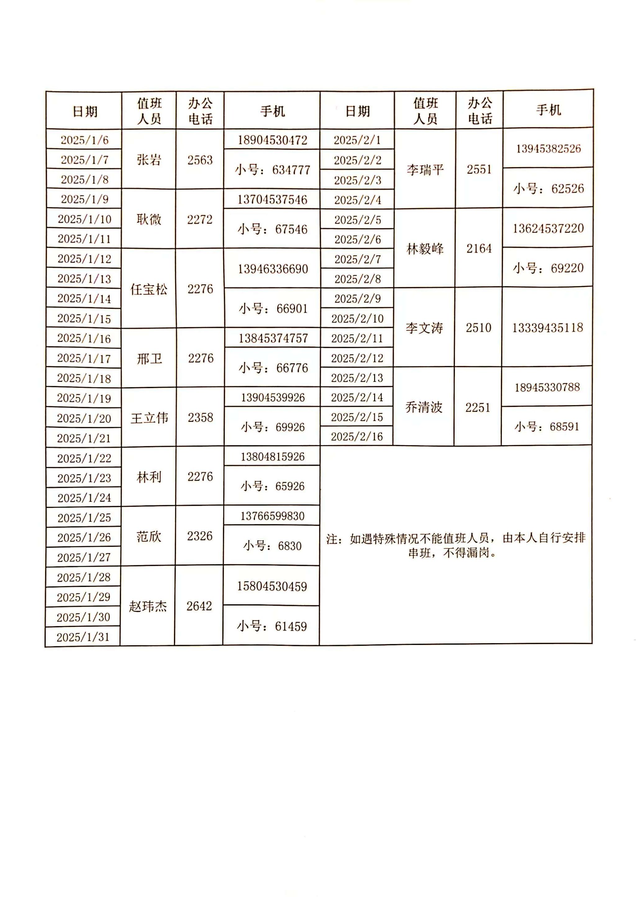 6.有工作任务的部门,在适当的是时间段做好轮休安排。第一餐饮中心、水暖中心、供电中心、房产中心、校园管理中心、学生公寓服务中心、市一院服务中心、卫生管理学院后勤服务中心根据工作需要合理安排好值班时间,将值班表电子版于2024年12月30日下班前报到处办公室。