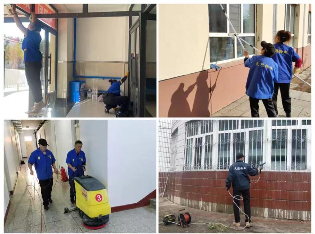 保洁人员全面清扫校内楼宇,并对部分地面进行集中清洗,去除室内卫生死角,打开门窗进行通风,特别针对门厅、走廊、卫生间等公共区及重点区域开展卫生清洁和消毒防疫。及时跟进清理新粉刷的教室及公共区域,保障正常教学秩序,保证环境整洁。