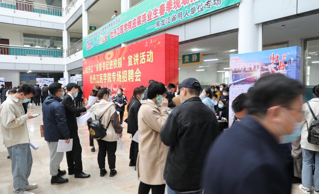 宣讲活动结束后,市、校双方领导及参会单位负责人到学校图书馆一楼阳光大厅招聘现场,与参加的用人单位进行交流,了解学生需求,会场内学生踊跃与招聘单位工作人员进行咨询,递交报名表。“书记进校园”活动牡丹江医学院宣讲推介会取得圆满成功。
