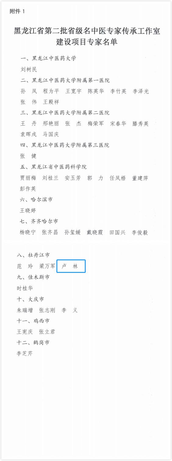 近日,《黑龙江省中医药管理局》公布了黑龙江省第二批省级中医传承工作室建设项目专家名单,我校附属红旗医院中西医结合·老年病科主任卢林榜上有名,成为黑龙江省第二批省级名中医传承工作室建设项目专家。