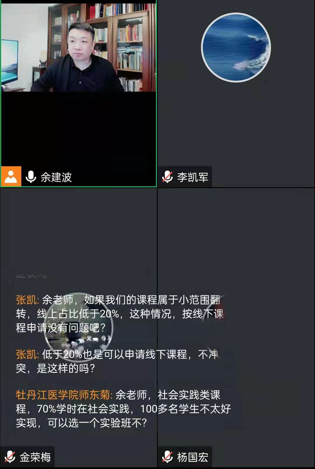 余建波老师从线上、线下、线上线下混合、虚拟仿真实验教学和社会实践五类一流课程建设政策解读入手,结合多年从事课程建设经验,通过多个案例,从申报与认定、建设要领、评审要点与指标、申报指南及附件材料等方面对一流课程申报要求进行深入系统的讲解,对申报过程中普遍存在的问题给予明确解答。与会教师还围绕一流课程线上、线下申报范围、一流课程申报注意事项等问题与余建波老师进行了交流互动。