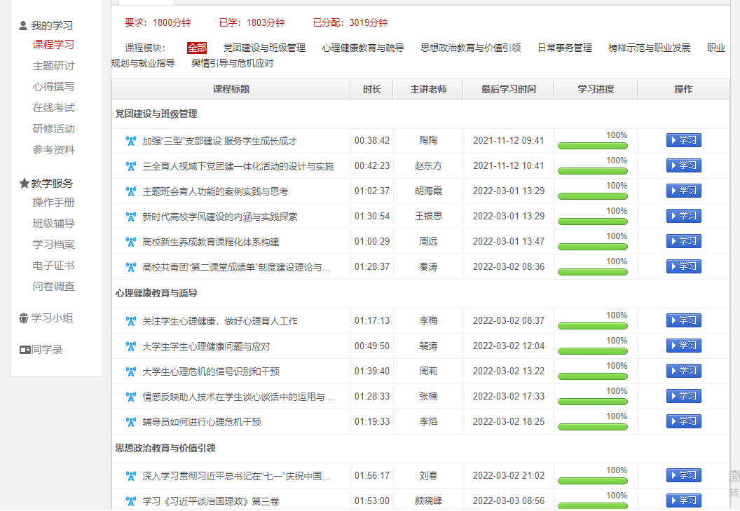 本次班主任培训从2021年12月启动,为期4个月,包括线上理论学习和线下专题辅导,内容涉及思想政治教育与价值引领、党团建设与班级管理、日常事务管理、舆情引导与危机应对、心理健康教育与疏导、职业规划与就业指导、榜样示范与职业发展、学校相关管理规章制度等多个方面,培训旨在帮助班主任提高政治理论水平、树立崇高职业理想、了解教育法律法规、学习先进教育理念、掌握基本从业技能,全面提升政治引导能力、管理服务能力与岗位适应能力,更好担负起立德树人的崇高使命。通过培训,大家普遍反映收获很大,表示今后将以更加饱满的工作热情、扎实的工作作风投入到学生工作中去,为学校学生工作发展注入新的生机与活力,为推动学校高质量发展贡献力量。