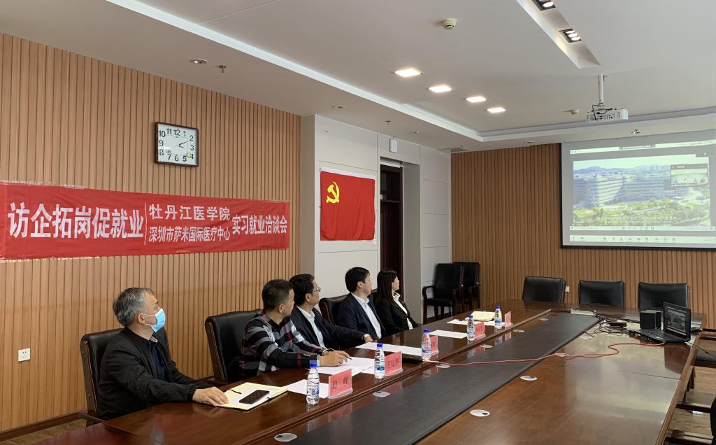 为贯彻落实教育部高校毕业生就业工作决策部署,牡丹江医学院目前采取“省外线上+市内线下”的模式,积极开拓省外沿海城市就业市场。2022年6月1日15时,在牡丹江医学院临床技能中心15楼会议室举办了访企拓岗促就业——牡丹江医学院与深圳市萨米国际医疗中心洽谈会。学校工会主席郭振海、教务处处长宋高臣、招生就业处处长王廷华、护理学院院长郎玉玲、第一临床医学院主管学生工作正处级辅导员赵峰出席了本次洽谈会;深圳市萨米国际医疗中心党委书记、法定代表人、副院长王诚,科教部李炜昕总监,护理部丁红总监,人力资源部张勇主任出席了本次洽谈会。