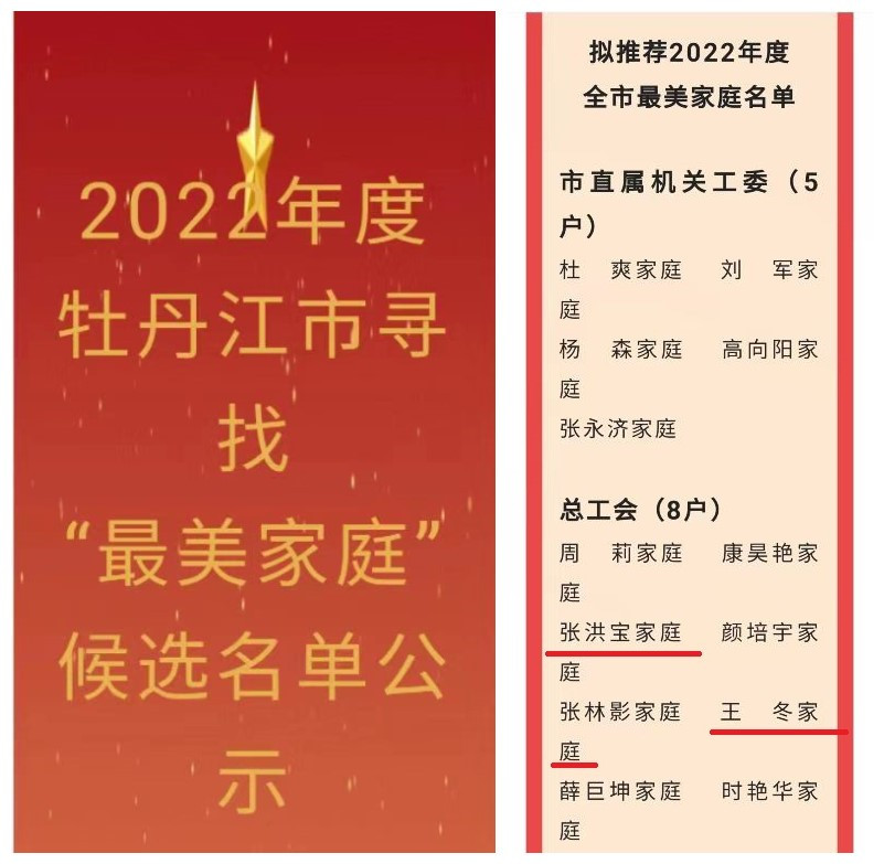 为深入贯彻习近平总书记关于注重家庭、注重家教、注重家风的重要指示精神,全面落实中央、省委、市委关于家庭文明建设工作的部署和要求,按照牡丹江市妇女联合会《关于开展2022年度寻找牡丹江市“最美家庭”推荐工作的通知》(牡妇发〔2022〕3号)文件要求,由学校工会组织评选推荐,学校党委审核,经牡丹江市总工会组织评选,牡丹江市妇女联合会综合审定,我校体育教研部张洪宝家庭、附属二院王冬家庭荣获牡丹江市2022年度“最美家庭”荣誉称号。