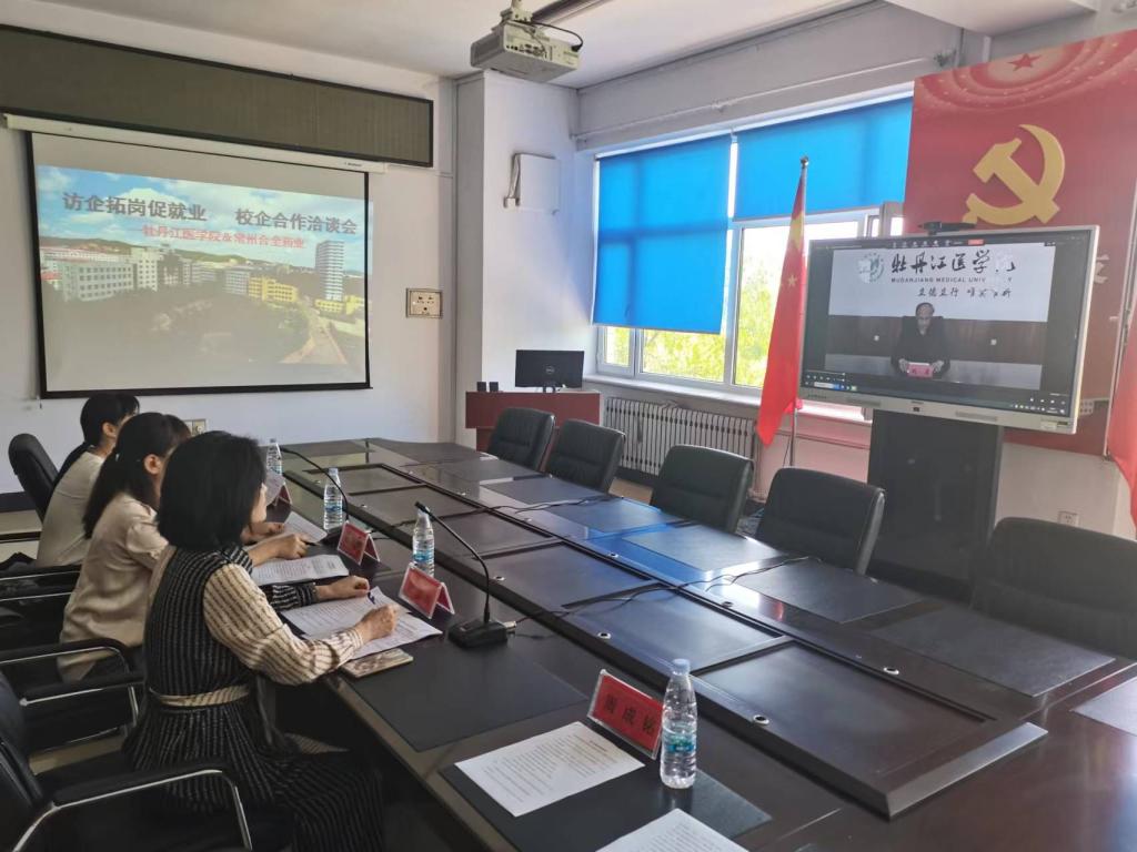 为更好地贯彻落实党中央、国务院“稳就业”、“保就业”决策部署,结合教育部、黑龙江省教育厅《书记校长访企拓岗促就业实施方案》要求,切实为2022届毕业生开拓就业市场、挖掘就业岗位,提升就业数量与质量,2022年7月13日14时,牡丹江医学院与常州合全药业有限公司校企合作视频洽谈会在药学楼4楼会议室召开。学校副校长刘星、药学院院长翟凤国、研究生处副处长赵君嫦、药学院副处级辅导员石杰、药学院实习就业管理科副科长周成铭出席本次洽谈会;常州合全药业有限公司人事经理沈汀、市场分析部主管王宪哲等4人在公司办公室出席本次洽谈会。会议由药学院副处级辅导员石杰主持。