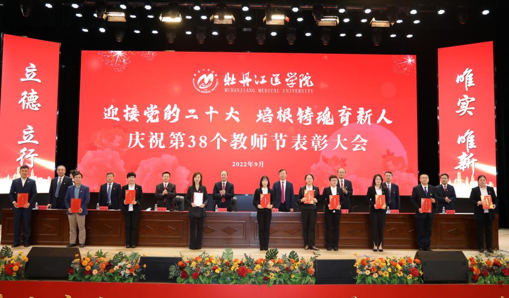 党委书记马宏坤在大会上致辞,代表学校党政领导向受表彰的先进集体和先进个人表示热烈的祝贺,向新入职各位教师表示热烈欢迎,向辛勤工作在教学、科研、医疗、管理和服务第一线的全校教职工致以节日的问候。他在讲话中指出:今年以来,全校上下深入贯彻落实习近平新时代中国特色社会主义思想和党的十九大及十九届历次全会精神,扎实开展能力作风建设年活动,统筹推进疫情防控和事业发展,不断强化学校内涵建设和服务地方能力,各方面工作取得积极进展。这些成绩的取得,离不开全校教职工特别是广大一线教师长期的默默奉献。正是广大一线教师日复一日地耕耘在三尺讲台,认真讲好每一堂课,悉心向学生传授知识,才支撑起牡丹江医学院事业发展的基石。马宏坤书记在讲话中称赞这些践行牡医精神的获奖教师是学校最靓丽的名片,号召广大教师以他们为榜样,再接再厉,再创辉煌。希望全体教职员工继续弘扬牡医精神,在各自的岗位上积极干事创业,用实际行动谱写学校高水平特色应用型医科大学建设新篇章,以优异成绩迎接党的二十大胜利召开!