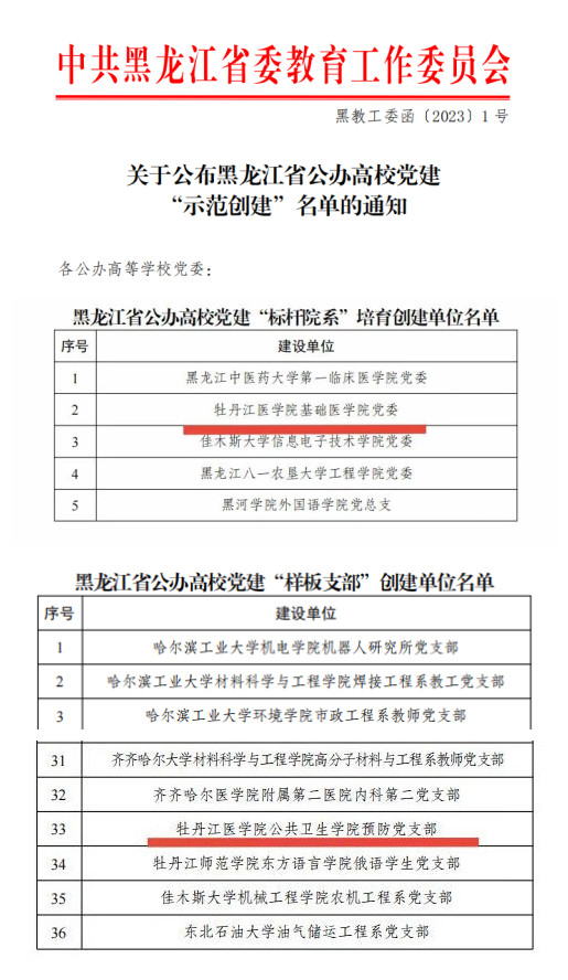 近日,省委教育工委公布了我省高校党建“示范创建”名单,我校基础医学院党委获批全省高校党建“标杆院系”培育创建单位;公共卫生学院预防党支部获批全省高校党建“样板支部”创建单位。(全省共产生公办高校党建“标杆院系”培育创建单位5个,党建“样板支部”创建单位50个)