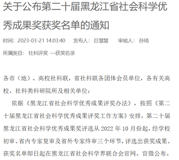 黑龙江省社会科学优秀成果奖每两年评选一次,着重奖励创新水平高、学术影响大、实践意义强的精品社科优秀成果。此次获奖标志着学校在人文社会科学研究领域实现了新突破。接下来,学校将持续加强优秀成果培育,力争产出更多高质量标志性成果,促进学校科研质量和内涵建设水平整体提高,再上新台阶。