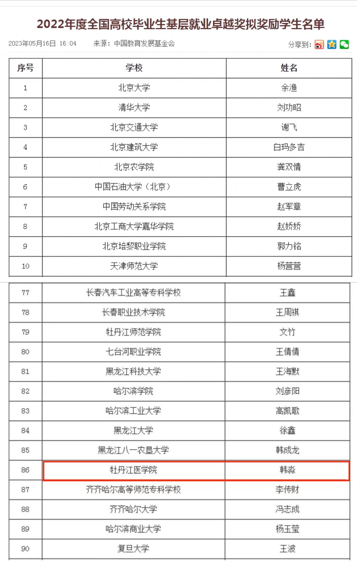 韩淼同学在全省全国高校毕业生基层就业卓越奖中,脱颖而出,作为黑龙江省11个候选人之一,推荐到教育部全国高校毕业生基层就业卓越奖评选人选。经各省(区、市)遴选推荐,全国共确定奖励优秀高校毕业生398人,优秀指导教师60人,韩淼同学名列其中。