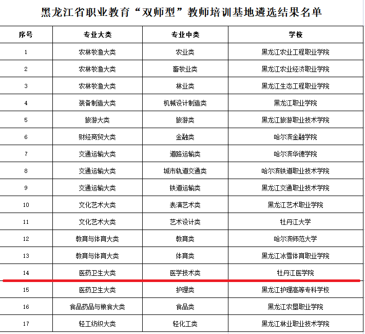 近日,黑龙江省教育厅发布了《关于公布黑龙江省职业学校双师型”教师培训基地遴选结果的通知》,确定17所院校为黑龙江省职业学校“双师型”教师培训基地,我校是入选的3所普通本科院校中唯一一所医药类院校。