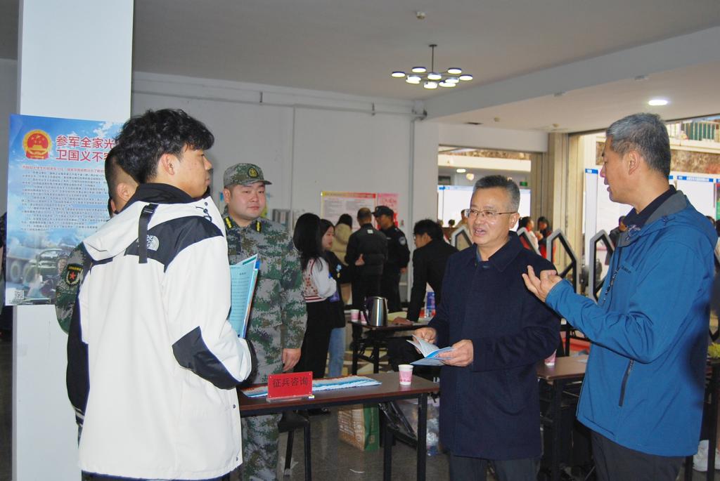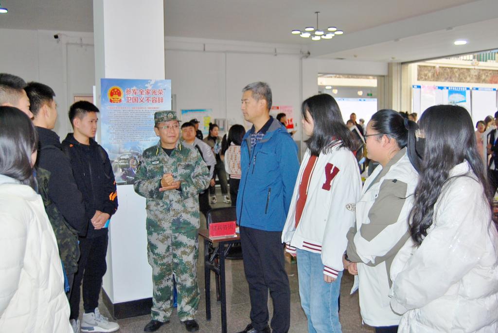 为进一步推动征兵宣传全覆盖,大学毕业生入伍精准发动,激励广大应届毕业生踊跃报名应征,10月30日上午,我校武装部借助学校秋季招聘会之机,在招聘会现场醒目位置设立了征兵宣传咨询点。学校征兵工作站负责老师现场开展宣传,与专门遴选的退役复学大学生代表现身说法,解疑释惑。学校党委副书记张德才亲临征兵政策宣传现场。