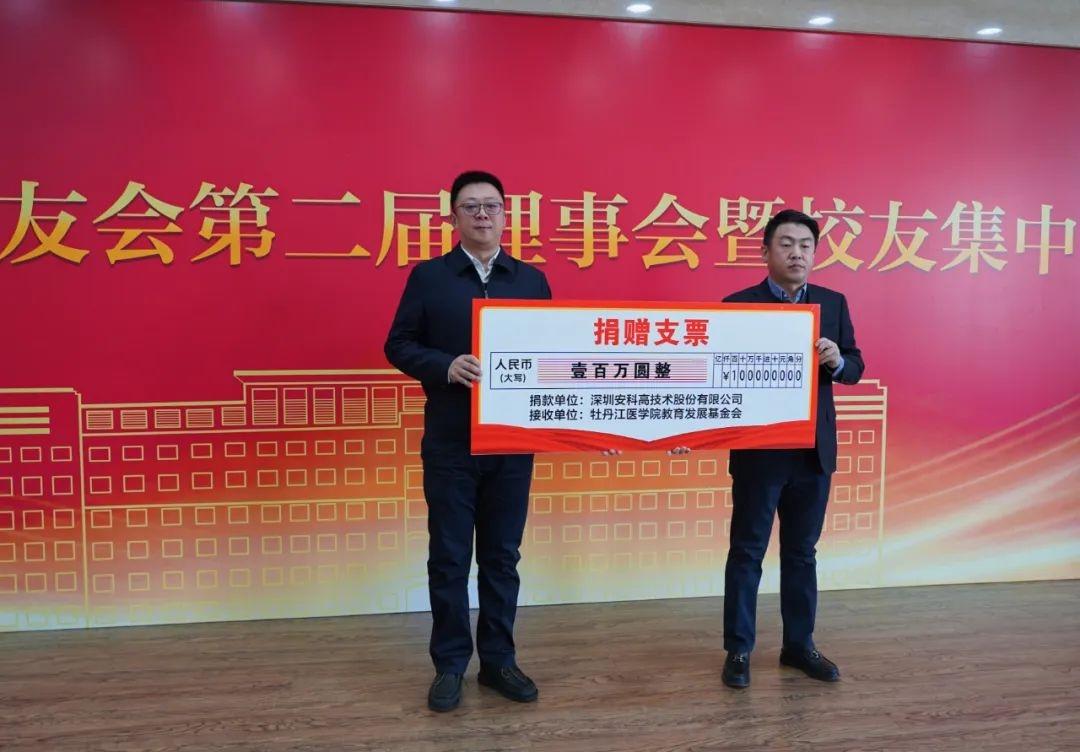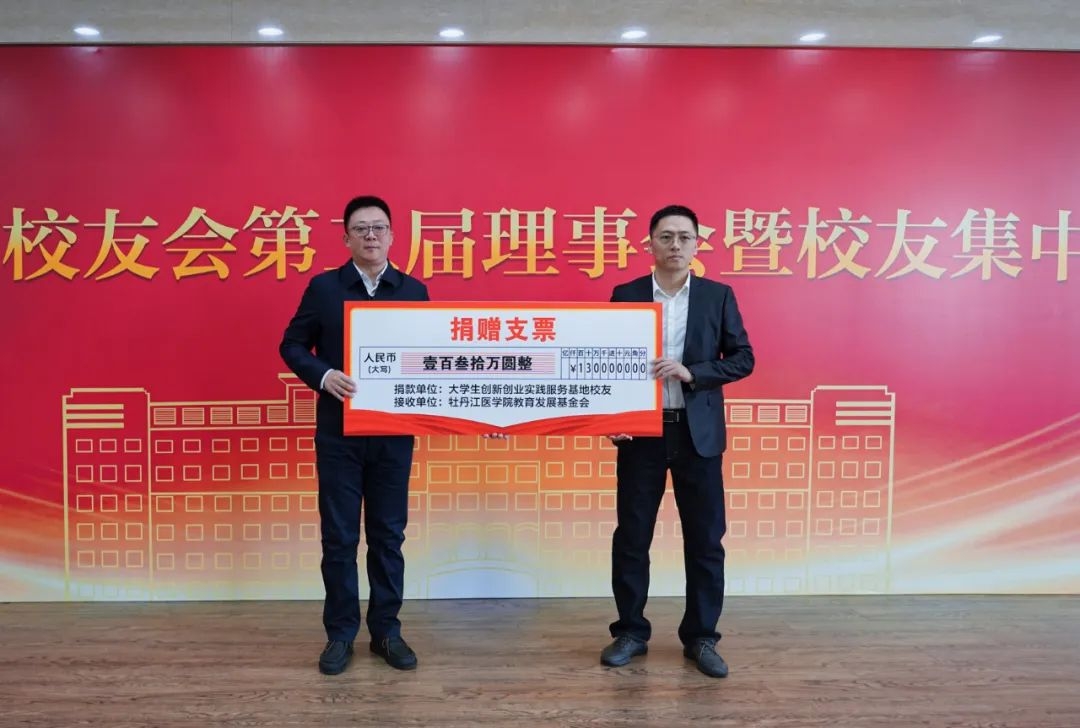 表彰大会后,举行了校友捐赠仪式。牡丹江医学院教育发展基金会收到校友捐赠人民币230万元,校友会副会长、秘书长、学校办公室主任于情代表牡丹江医学院教育发展基金会接收了校友捐赠。