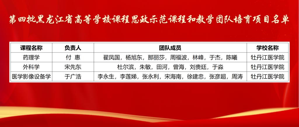 药学院付惠老师主讲的《药理学》、第一临床医学院宋先东老师主讲的《外科学》、医学影像学院于广浩老师主讲的《医学影像设备学》3门课程及团队获批第四批黑龙江省高等学校课程思政示范课程和教学团队培育项目(本科教育)。