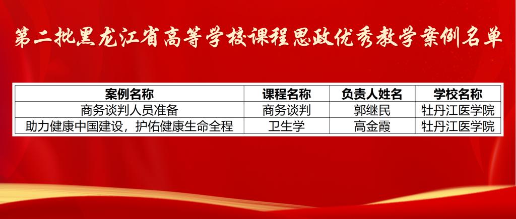 卫生管理学院郭继民老师的《商务谈判人员准备》、公共卫生学院高金霞老师的《助力健康中国建设,护佑健康生命全程》2个教学案例获批第二批黑龙江省高等学校课程思政优秀案例。