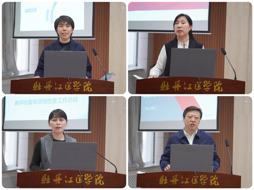 会议首先由三个专项检查领导小组组长针对检查中发现的问题进行汇报并提出整改建议。试卷和形成性评价专项检查小组组长李丽按照考试档案管理规范,逐条指出了各教学单位在考试档案、试卷、过程性考核材料等方面存在的问题,并以问题为导向,提出了整改的意见。她指出,各学院要认真组织教师学习考试材料的管理制度和文件通知要求,要深入思考考核方案与教学大纲的达成度,并进一步规范和严格要求考试相关材料的内容、格式和质量。毕业论文(设计)专项检查小组组长师东菊首先介绍了本次专项检查的总体情况,并提出毕业论文(设计)的重要性以及在检查中发现的一些学院的亮点工作,指出各学院在论文管理方面和毕业论文(设计)质量方面存在的一些共性问题和个性问题,结合学习过的两所学校的经验,提出了下一步整改建议。她提出,毕业论文指导工作,是体现学校教学工作严谨性、规范性的载体,整改工作时间紧、任务重,各学院要取长补短,携起手来,克服困难,全面推进迎检工作。教学档案专项组组长王芳对标对表,分别从教学档案管理和教学档案内容两个方面指出了检查中发现的问题并提出了下一步改进建议。她指出,各学院应根据自身学科、专业特点,形成学院方面和教研室方面的教学档案目录,规范封面、图表及文件内容,以评促建,从日常工作抓起,推动各项工作的日常规范。