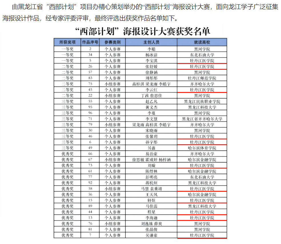 近日,由黑龙江省“西部计划”项目办精心策划举办的“西部计划”海报设计大赛获奖名单公布,全省共评选出33个获奖作品,其中我校获奖作品11项,包括一等奖1项、二等奖2项、三等奖2项以及优秀奖6项,获奖数量位列榜首。