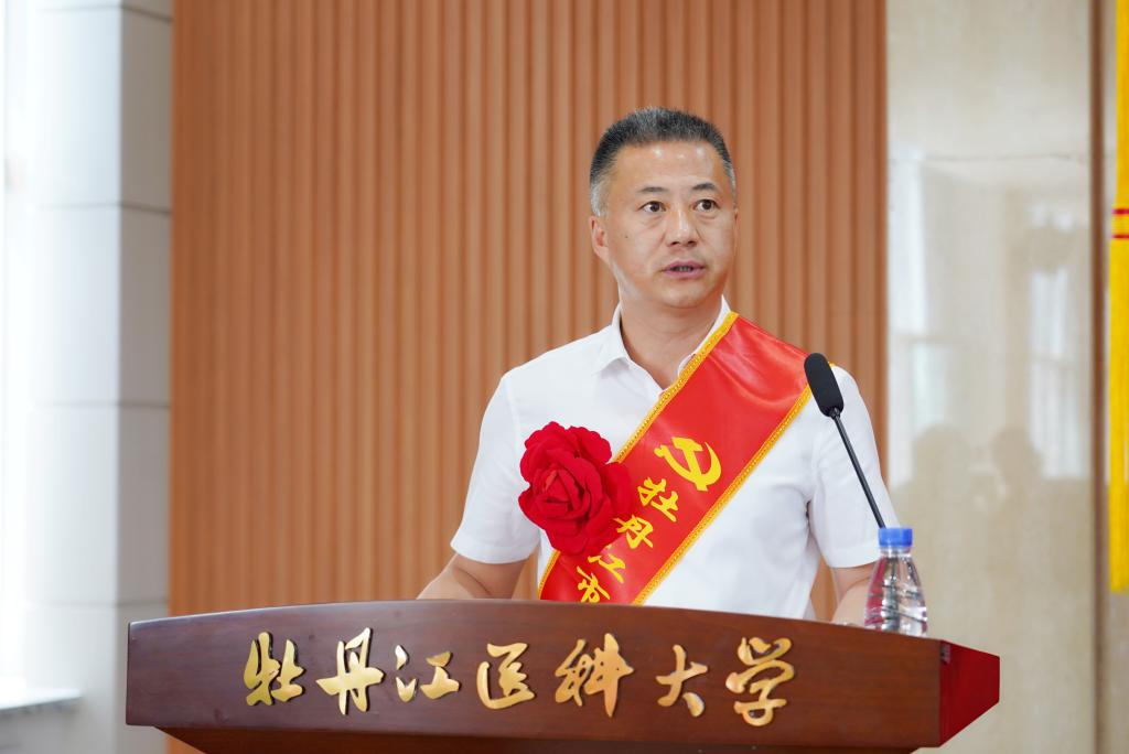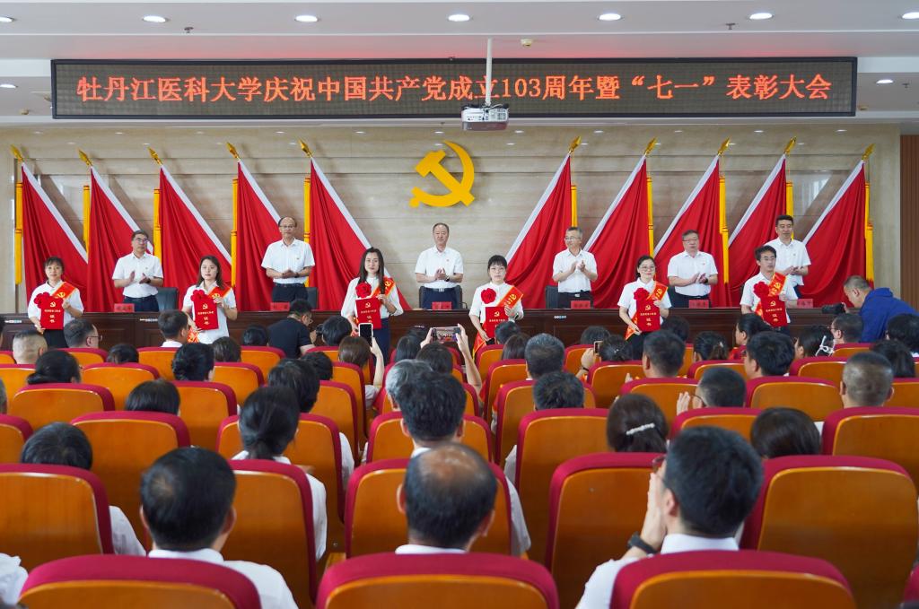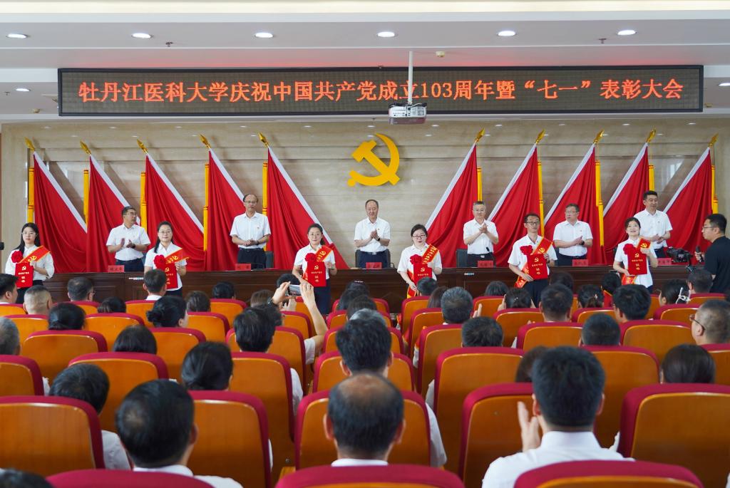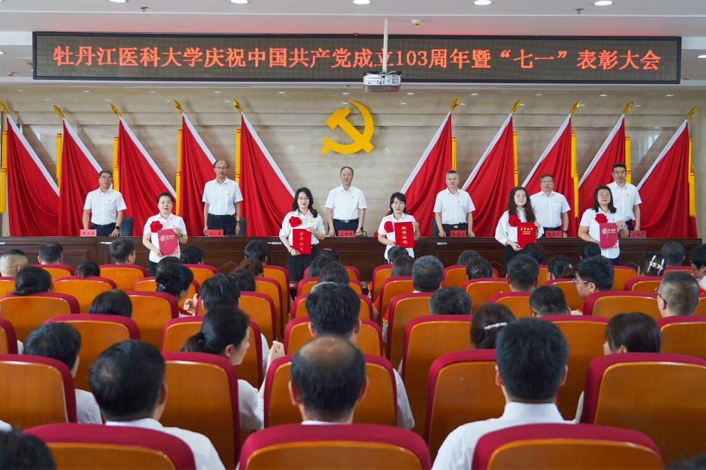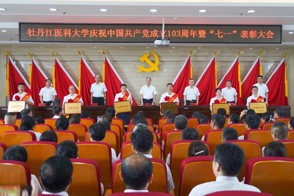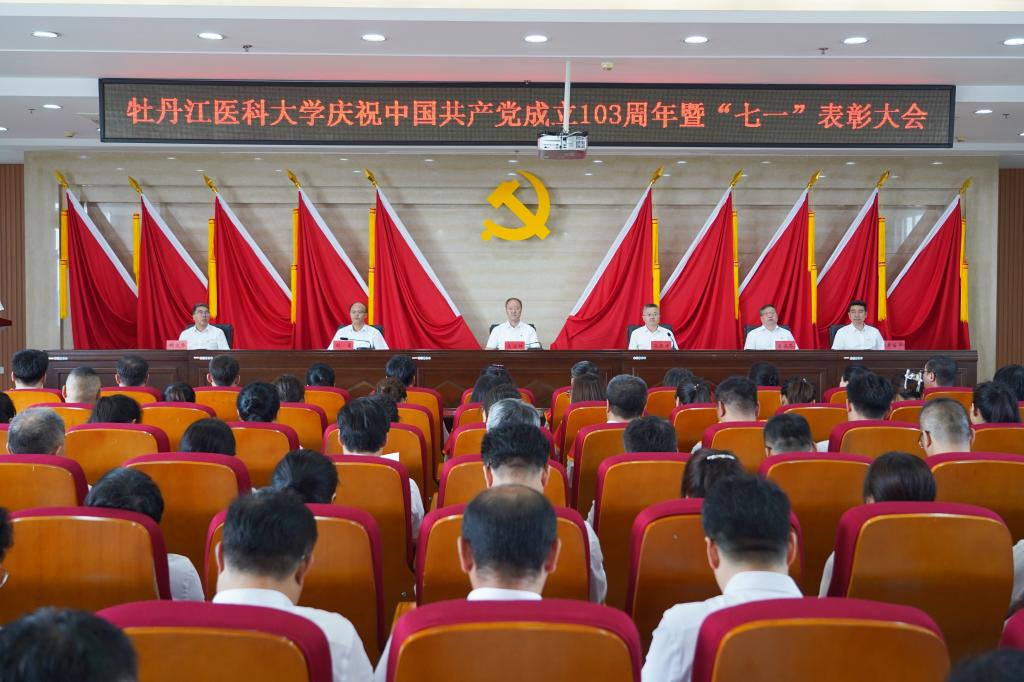 百年征程波澜壮阔,百年初心历久弥坚。为庆祝中国共产党成立103周年,表彰先进、鼓舞斗志,进一步动员和激励广大基层党组织、共产党员和党务工作者凝心聚力为创建高水平医科大学作出新的更大贡献,6月27日上午,学校在临床技能实习实训中心17楼召开牡丹江医科大学庆祝中国共产党成立103周年暨“七一”表彰大会。学校领导班子成员,处级干部,受市级和校级表彰的优秀共产党员、优秀党务工作者、先进基层党组织,近三年在省、市党建重要工作中取得优异成绩的共产党员,各基层党组织党员代表参加会议。学校党委书记马宏坤发表讲话,会议由党委副书记张德才主持。